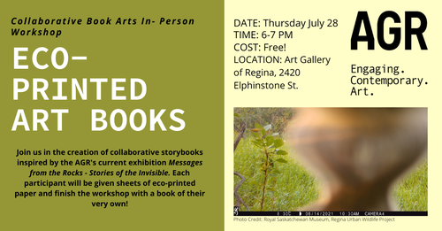 Join the Art Gallery of Regina's Summer Art Educator, Emily Nestor, to create collaborative storybooks inspired by the AGR's current exhibition Messages from the Rocks - Stories of the Invisible. Working with sheets of eco-printed paper, participants will leave this collaborative bookmaking workshop with a varied edition artist's book. Each sheet of eco-printed paper is dyed with a unique pattern of natural pigments created by placing local plant leaves and flowers on treated paper and running it through a roller press. Taking inspiration from Messages From the Rocks - Stories of the Invisible, participants will be asked to seek out the unseen and unexplained in the abstract shapes created by the eco-printing process. Each participant will add to these abstract shapes using pen and ink, transforming them into places, plants, animals, inanimate objects, or perhaps invisible things. The participants will then trade their drawn paper with others, collaboratively developing stories from the vague traces of vegetable pigment by adding additional drawing or text. Books will be finished using various needle and thread bookbinding techniques. The AGR supplies materials for this workshop. This workshop is suitable for adults, youth and children aged ten and older.