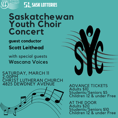 Join the Saskatchewan Youth Choir and guest conductor Scott Leithead with special guests Wascana Voices for a concert followed by reception. The Saskatchewan Youth Choir is made up of singers ages 14 to 22 from around the province who rehearsed together over two weekends to bring this first in-person concert to you since 2020.