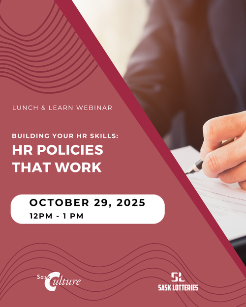 SaskCulture, in partnership with Knibbs HR Consulting, is pleased to present the second webinar in our four-part series designed to provide practical, accessible, and sector-relevant HR knowledge. Join us on October 29th for HR Policies that Work. This webinar will review which policies are essential for any non-profit, as well as walk through how to draft policies in plain language with clarity on who is responsible for what. Board vs. staff roles in policy approval and oversight will be explored and how policies reflect organizational culture and values, not just legal rules.