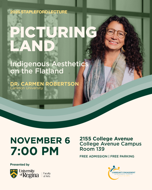 The Faculty of Arts and the Community Engagement and Research Centre are hosting the upcoming Stapleford Lecture on November 6th at 7PM on the College Ave campus. Our presenter this year is Dr. Carmen Robertson, a former FNUniv Dept Head of Indian Fine Arts and U of R MAP faculty member. She is the current Tier 1 Canada Research Chair in North American Indigenous Visual and Material Culture at Carleton University. Dr. Robertson will be speaking on the topic, Picturing Land: Indigenous Aesthetics on the Flatland. It will be an amazing conversation about Indigenous art history in Saskatchewan!