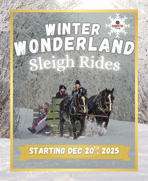 ● Sleighrides in a magical winter setting with cozy blankets ● Experience the warmth of the Champetre County Saloon and buy a pre-ride beverage ● Explore the Lost Corral Maze and spend time with cuddly farm animals ● Overnight and weekend stays available in our newly refurbished cabins ● Campfire with hot chocolate Not Included:
