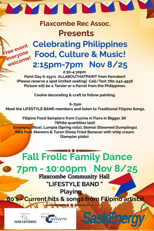 Celebrating Philippines Food, Culture & Music. Youth will be painting a Tarsier or Parrot from the Philippines. Youth will decorate a cookie of the flag colours and put up flags. Later in early evening we have a sampler plate of Filipino foods. Followed by a band playing Traditional Filipino Songs. Leading into a Fall Frolic Family Dance.