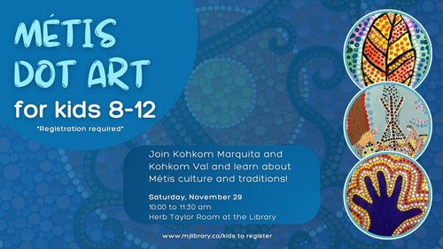 Join us for a creative & engaging program ideal for kids 8 to 12 years old. This program will be taught by guest presenters Marquita Neufeld and Val Trudel. Participants will learn about Métis culture and traditions and participate in a Métis dot art activity. Métis dot art stems from the Métis tradition of floral beadwork and focuses on the practice of patience and community building.